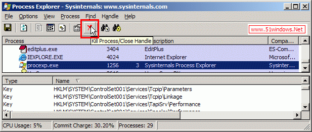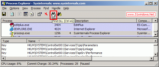 打開procexp.exe,按下面提示打開Find Handle