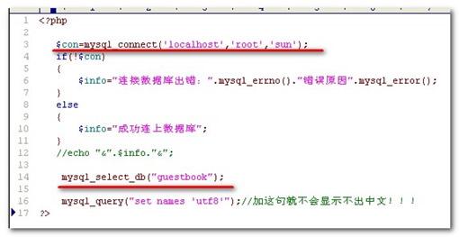 1、先介紹如何用PHP連上數(shù)據(jù)庫(kù)(數(shù)據(jù)庫(kù)用戶名“root”,密碼“sun”,有庫(kù)“myguestbook”)