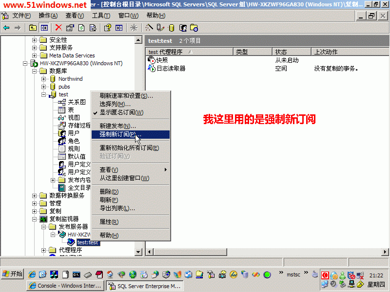 6、發(fā)布建好后,我們有強(qiáng)制新訂閱來發(fā)布,如果要同步到多臺(tái)機(jī)器,只要操作多次,選擇不同的訂閱服務(wù)器就可以了。