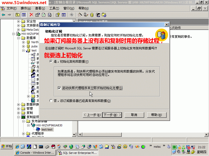 9、根據(jù)要求,選擇是否初始化,初始化的過程,就是將在訂閱服務(wù)器上創(chuàng)建傳輸用的存儲(chǔ)過程,新建表,同步初始的數(shù)據(jù)。