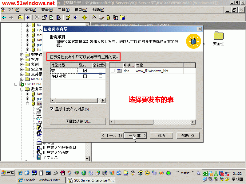 4、選擇要發(fā)布的表,注意:只有帶主鍵的表才可以發(fā)布