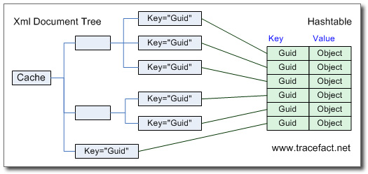 使用這種方式,Hashtable的實(shí)際的Key,即動(dòng)態(tài)生成的GUID對(duì)程序員來說是透明的,程序員在存儲(chǔ)/獲取對(duì)象時(shí),只需要提供XPath表達(dá)式就可以。下面這幅圖說明了它們之間的關(guān)系: