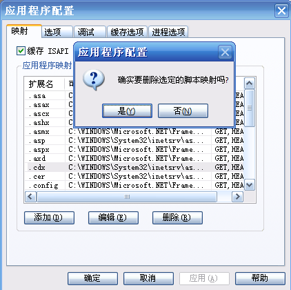 在新彈出的對話框中選擇是,則該類型的腳本映射被刪除,IIS將不會再用asp.dll組件來解析.cdx后綴的文件了。