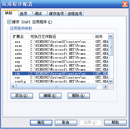 在新開的配置窗口中,我們可以看到各種后綴名,這些都是IIS可以執(zhí)行的文件名稱后綴,名稱后面的欄目中說明了這種類型的文件,會由那個(gè)組件來解析執(zhí)行它。