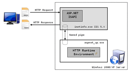 IIS 5.x 一個(gè)顯著的特征就是 Web Server 和真正的 ASP.NET Application 的分離。作為 Web Server 的IIS運(yùn)行在一個(gè)名為 InetInfo.exe 的進(jìn)程上,InetInfo.exe 是一個(gè)Native Executive,并不是一個(gè)托管的程序,而我們真正的 ASP.NET Application 則是運(yùn)行在一個(gè)叫做 aspnet_wp 的 Worker Process 上面,在該進(jìn)程初始化的時(shí)候會(huì)加載CLR,所以這是一個(gè)托管的環(huán)境。
