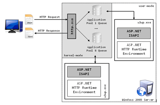 在User Mode下,http.sys接收到一個(gè)基于 aspx 的http request,然后它會(huì)根據(jù)IIS中的 Metabase 查看該基于該 Request 的 Application 屬于哪個(gè)Application Pool, 如果該Application Pool不存在,則創(chuàng)建之。否則直接將 request 發(fā)到對(duì)應(yīng)Application Pool 的 Queue中。