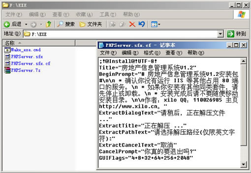 這些相信也不用我解釋了,想顯示什么就改什么。注意這句InstallPath="D:\\PHPServer"為安裝目錄,還有解壓后運(yùn)行RunProgram="cmd /c setup.cmd"這個(gè)BAT,也就是啟動(dòng)apache,mysql服務(wù)的命令了。下面就是PHPServer的setup.cmd的命令了。因?yàn)樘嗪?jiǎn)單貼上幾句!