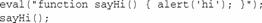這里,函數(shù)sayHi()是在eval()調(diào)用內(nèi)部定義的。因?yàn)樵撜{(diào)用將被替換為真正的函數(shù),所以仍可在接下來(lái)的一行中調(diào)用sayHi()。