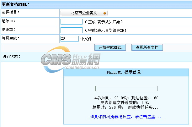 接下來我們繼續(xù)測試列表頁面的生成,這次我們學乖了,先把模板(list_article.htm)中的arclist標簽刪除后再測試,但是生成效果依然非常不理想。如下圖,每個列表頁面生成時間接近20秒(我們修改了頁面結果輸出提示,為了大家更方便看到每個列表頁面生成時間),按照每頁50條數(shù)據(jù)計算,生成單個欄目的3萬數(shù)據(jù)理論上也要花費3個多小時,生成90萬數(shù)據(jù)……無語ing。由于列表內容使用的是list標簽,這是一個和arclist有點類似的標簽,因此我們不能延續(xù)上面的做法來解決問題,只能另辟蹊徑。