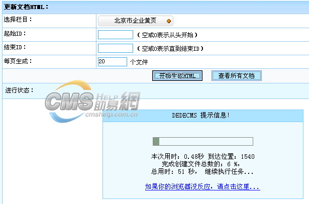 解決方案3:也是小組建議的解決方案,那就是充分挖掘現(xiàn)有dedecms的功能,在盡量不改變程序的基礎上,大幅提高效率。具體的方法就是通過freelist(自由列表生成)功能事先生成熱門文章、最新文章、相關文章等內容的列表頁面,然后使用dedecms提供的include標簽直接引入文檔頁面。標簽格式為:{dede:include file='列表頁面文件名稱' ismake=' no'/}。這個方案優(yōu)點在于僅增加部分操作步驟,沒有改動任何程序,性能提高亦非常明顯。下圖就是我們利用這個方法優(yōu)化后的生成速度,僅用時50秒就完成了1500多頁的文章生成,達成目標優(yōu)化效果。此方案由于增加了操作步驟,懶人慎用。