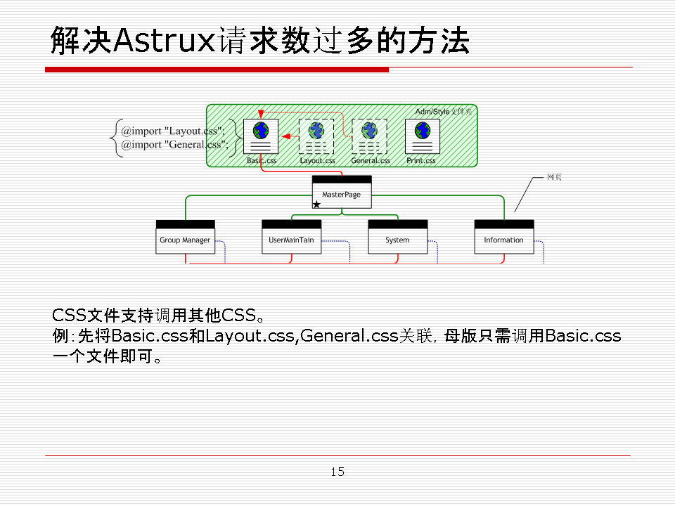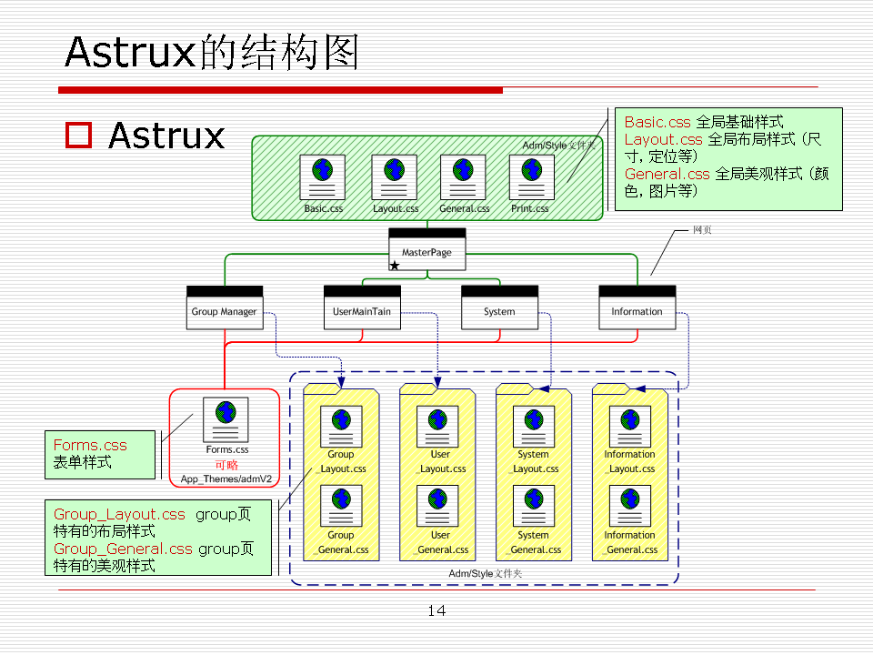 圖上方藍(lán)色虛線框是單一CSS部分,其中每一張子頁都有對應(yīng)的文件夾用來存放自己獨有的CSS文件。它們存放在styles/x文件夾中。 由各自對應(yīng)的C#文件控制:打開不同的子頁時,母版加載當(dāng)前頁的CSS。