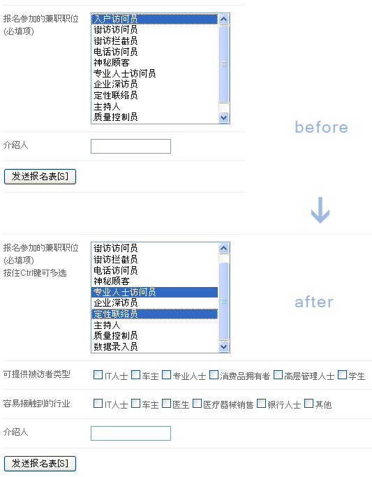這是一份報(bào)名表單,要求用戶在選中“專業(yè)人士訪問員”和“定性訪問員”后,分別顯示“可提供被訪者類型”和“容易接觸到的行業(yè)”的對應(yīng)表單。當(dāng)呈未選中狀態(tài)時(shí),這2個(gè)框也對應(yīng)的隱藏起來。