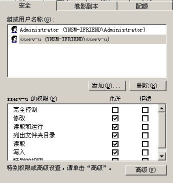 假設(shè)你有一個(gè)WEB目錄,路徑是d:\web。那么在這個(gè)目錄的“安全設(shè)定”里除了管理員和IIS用戶都刪除掉,再加入SSERVU賬號(hào),切記SYSTEM賬號(hào)也刪除掉。為什么要這樣設(shè)置呢?因?yàn)楝F(xiàn)在已經(jīng)是用SSERVU賬號(hào)啟動(dòng)的SERV-U,而不是用SYSTEM權(quán)限啟動(dòng)的了,所以訪問目錄不再是用SYSTEM而是用SSERVU,此時(shí)SYSTEM已經(jīng)沒有用了,這樣就算真的溢出也不可能得到SYSTEM權(quán)限。另外,WEB目錄所在盤的根目錄還要設(shè)置允許SSERV-U賬號(hào)的瀏覽和讀取權(quán)限,并確認(rèn)在高級(jí)里設(shè)置只有該文件夾。(見圖14)