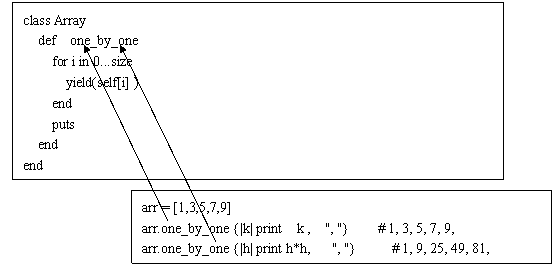 class Array def one_by_one for i in 0...size yield(self[i] ) end puts end end