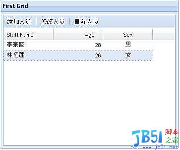 這個(gè)Demo為了演示如將使用GridPanel顯示數(shù)據(jù),并為GridPanel添加工具條按鈕,提供彈出式窗體新增數(shù)據(jù)。