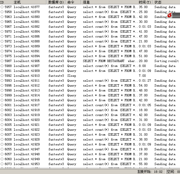 記得以前發(fā)生過一個問題也是檢查了好久都沒解決的,故障一發(fā)生CPU就跑到100%左右,系統(tǒng)沒響應(yīng),MYSQL、JBOSS進(jìn)程死。當(dāng)初是通過對一些大數(shù)據(jù)表建立索引解決的!這次問題現(xiàn)象和這個有點象,死的時候幾乎服務(wù)沒有響應(yīng),通過查看后臺MYSQL進(jìn)程,居然已經(jīng)超過我設(shè)置的1000個限制,第1天我把配置改成3000,想想是否跟這個有關(guān),最近的訪問量增大了。說實話,我還是不相信并發(fā)1000個連接,但事實擺在面前,現(xiàn)在就是1000個進(jìn)程堵在這!第2天發(fā)現(xiàn)3000也不行了,在進(jìn)程列表中看到基本上很容易就進(jìn)程滿,而且每個進(jìn)程都在sending data 狀態(tài),查找了2天還是無法解決問題,不論是重新配置啟動參數(shù)還是檢查外來攻擊都無法解決,按照一些人的說法,把臨時緩沖表增大到512M也是沒有任何幫助。象這種的每增加個連接都幾乎會卡死,而且是sending data 狀態(tài)!是數(shù)據(jù)無法發(fā)出還是查詢不能完成呢?