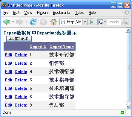 從ASP.NET 2.0起引入了一批新的功能強大的視圖控件,例如Gridview、FormView和DetailsView等等。通過和數(shù)據(jù)源控件的簡單結(jié)合,在許多情況下,僅需要簡單的配置方式就可以開發(fā)出功能強大的應(yīng)用程序。但遺憾的是,Gridview控件中并沒有提供像在FormView和DetailsView控件中那樣直接插入新記錄操作的支持。圖1給出了典型的使用控件展示數(shù)據(jù)庫數(shù)據(jù)的情形。