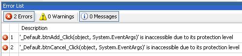 特別值得注意的是 ,在這里你必須以內(nèi)聯(lián)方式把按鈕“Add”與“Hide”的Click事件處理器函數(shù)放置于ASPX文件之中,而不能放到代碼文件Default.aspx.cs中;否則,會出現(xiàn)如圖3所示的編譯錯誤。
