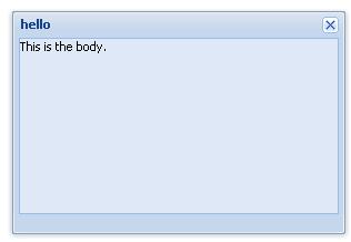 var win=new Ext.Window({title:"hello",width:300,height:200,html:'This is the body.'});