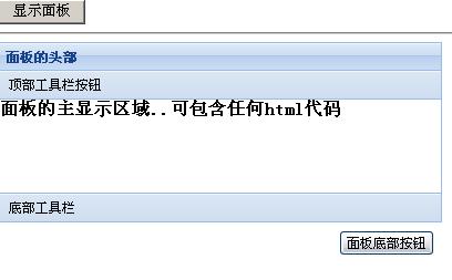 面板由一個(gè)工具欄、一個(gè)底部工具欄、面板頭部、面板尾部和面板主區(qū)域幾個(gè)部分組成。面本類中還提供了面板展開、關(guān)閉等功能。并提供了一些可重用的工具按鈕讓我們靈活的控制面板。面板可以放入其他任何容器中,面板本身也是一個(gè)容器,所以面板里面也可以包含其他組件。面板的類名為Ext.Panel,其xtype為panel。
