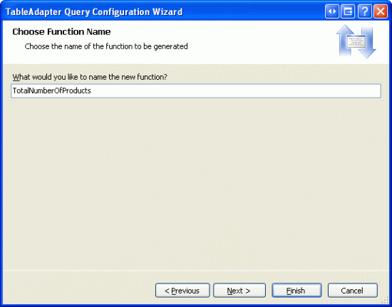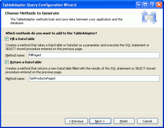 最后給方法命名.象前面的方法一樣,選擇Fill a DataTable 和Return a DataTable,為第一個(gè)命名為FillPaged ,第二個(gè)為GetProductsPaged.