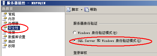 2、在“服務器屬性”對話框中,選擇“選擇頁/安全性”,將“服務器身份驗證”選為“SQL Server 和 Windows身份驗證模式”,點擊“確定”并重啟數(shù)據(jù)庫服務。如下圖所示。