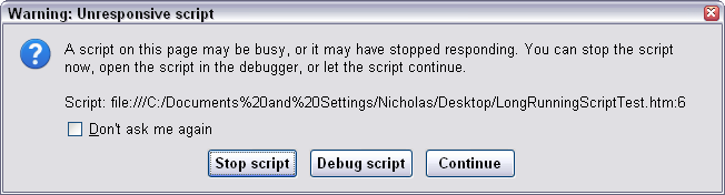 這個(gè)對(duì)話框提示:“這個(gè)頁(yè)面上有一段腳本導(dǎo)致Internet Explorer運(yùn)行緩慢,如果你繼續(xù)運(yùn)行,你的計(jì)算機(jī)可能會(huì)變?yōu)闊o(wú)響應(yīng)狀態(tài)”。要不是追求技術(shù)上的準(zhǔn)確性,這樣說(shuō)確實(shí)有點(diǎn)過了。對(duì)話框有兩個(gè)選項(xiàng),要么 停止腳本執(zhí)行,要么允許腳本繼續(xù)運(yùn)行。當(dāng)這個(gè)對(duì)話框顯示的時(shí)候,腳本已經(jīng)被完全停止了。如果你選擇繼續(xù)運(yùn)行腳本,就會(huì)重新計(jì)算當(dāng)前執(zhí)行的語(yǔ)句數(shù),也就是 說(shuō),如果這個(gè)數(shù)值再次達(dá)到上限時(shí),你會(huì)再次看到這個(gè)對(duì)話框。