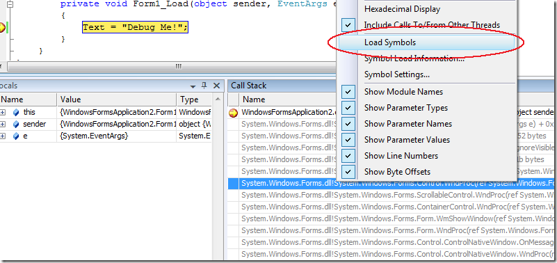 運行你的工程命中斷點,到調用堆棧窗口(CTRL+ALT+C).在調用堆棧里,右鍵單擊System.Windows.Forms.dll,然后選擇"Load Symbols"。這樣會給System.Windows.Forms程序集加載符號,大小大概10M,所以下載速度就看看你的網(wǎng)絡連接速度怎么樣了。注意:在這個過程中Visual Studio會沒有任何響應的。但是,這個下載對每個程序集來說只需要一次。這個符號(PDB)文件會緩存在你的機器上,在你剛才定義的文件夾里。