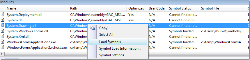 在你調試進入Graphics.DrawRectangle,你需要加載System.Drawing.dll的符號。打開Modules Window(CTRL+ALT+U)。這個列表會顯示調試中所有加載的模塊(DLLs).在列表中找到System.Drawing.DLL,右鍵單擊,然后選擇Load Symbols.