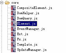 底層API(core):底層API中提供了對(duì)DOM操作、查詢的封裝、事件處理、DOM查詢器等基礎(chǔ)的功能。其它控件都是建立在這些底層api的基礎(chǔ)上,底層api位于源代碼目錄的core子目錄中,包括DomHelper.js、Element.js等文件,如圖xx所示。