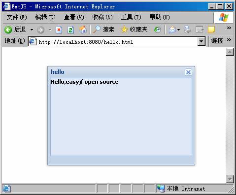 var win=new Ext.Window({title:"hello",width:300,height:200,html:'<h1>Hello,easyjf open source</h1>'});