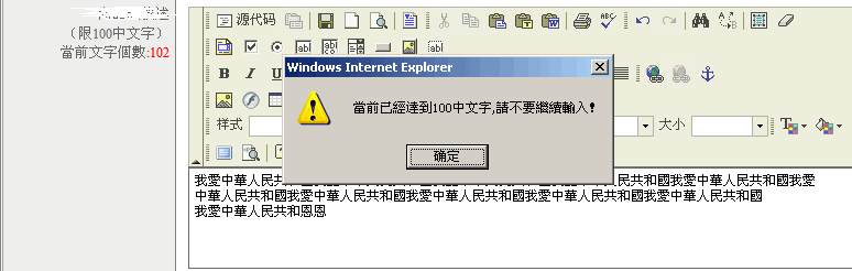 alert("當前已經達到100中文字,請不要繼續(xù)輸入!");