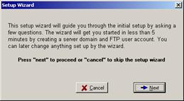 (1) 啟動(dòng)Serv-U程序,打開Serv-U Administrator窗口,此時(shí)將顯示Setup Wizard對(duì)話框,如圖10-13所示。利用該對(duì)話框可以輕松地完成基本設(shè)置。