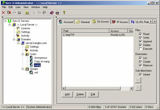在使用Serv-U管理員創(chuàng)建服務(wù)器站點(diǎn)時(shí),我們已創(chuàng)建了一個(gè)Anonymous用戶和一個(gè)wang用戶。管理員也可以根據(jù)需要,增加、刪除、復(fù)制或禁用用戶。