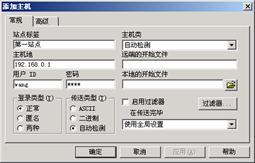 ● 在專用的FTP客戶端應(yīng)用程序設(shè)置中,如CuteFTP Version 4.2中文版,按如圖10-18所示,在“站點(diǎn)標(biāo)簽”文本框中輸入站點(diǎn)標(biāo)簽名稱(任意);在“主機(jī)地址”文本框中輸入FTP服務(wù)器站點(diǎn)地址192.168.0.1;在“用戶ID”和“密碼”文本框中分別輸入用戶名和密碼。然后單擊“確定”按鈕。