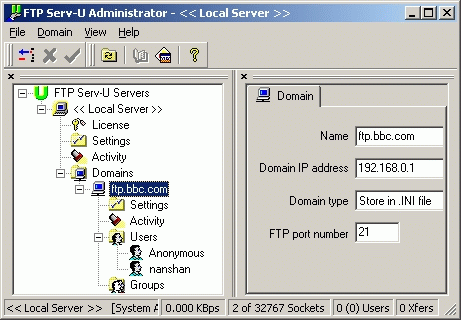 4、從上圖中可以看到,現(xiàn)在已經(jīng)建立好了一個(gè)FTP服務(wù)器,服務(wù)器地址為“ftp.bbb.com”,其下有兩個(gè)用戶,一個(gè)是匿名用戶“Anonymous”,其密碼為空;一個(gè)是普通用戶“nanshan”,其密碼為在向?qū)е休斎氲膬?nèi)容。