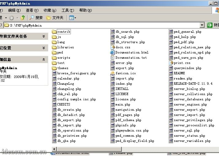 3.6.1、在D:\PHP下建立名為phpMyAdmin的目錄,將下載得到的phpMyAdmin-2.11.9.4-all-languages.zip解壓后把其內(nèi)文件和文件夾復(fù)制到里面。【圖六十所示】