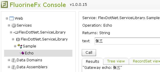 到這里我們可以簡單的測試FluorineFx的.NET服務(wù)端是否成功創(chuàng)建。通過在瀏覽器中查看FluroineFx網(wǎng)站中的Console.aspx或是將網(wǎng)站設(shè)置為啟動項(xiàng)目并設(shè)置Console.aspx為啟始頁運(yùn)行網(wǎng)站都可以,程序便會運(yùn)行到FluorineFx的控制臺,展開左邊項(xiàng)目的Services節(jié)點(diǎn)便會看到上面模板為我們創(chuàng)建的類和方法,點(diǎn)擊方法節(jié)點(diǎn)在右邊就可以進(jìn)行簡單的測試了,如下圖示: