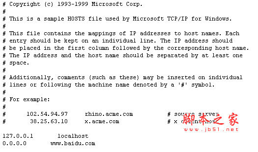 第二步:在記事本末尾加上0.0.0.0這個(gè)IP,并在后面跟上想要禁止訪問的域名(www.baidu.com)
