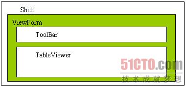 在上一步創(chuàng)建好ActionGroup中的Action后,接下來就是要在界面中加上工具欄。先要將布局用ViewForm類來調(diào)整一下,ViewForm也是繼承自Composite的一個容器。原先表格是建立在Shell之上的,現(xiàn)在要在Shell上再插入一個ViewForm容器,以它為基座將工具欄和表格創(chuàng)建于其中,如圖14.9所示。