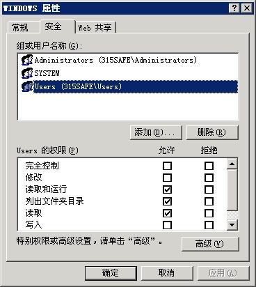 Windows目錄要加上給users的默認權(quán)限,否則ASP和ASPX等應(yīng)用程序就無法運行。以前有朋友單獨設(shè)置Instsrv和temp等目錄權(quán)限,其實沒有這個必要的。