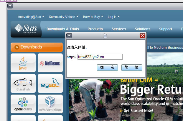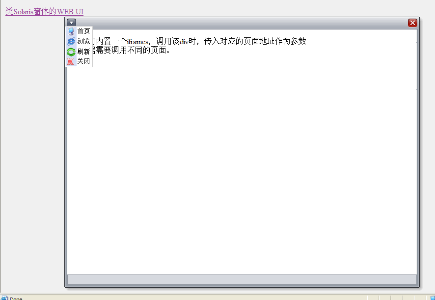 點擊類 Solaris 窗體的 WEB Ui 鏈接,彈出一個 Solaris 樣式的小窗體,同時背景變暗,該窗體帶陰影,可以拖動,點擊左上上腳的小箭頭,彈出一個菜單。點擊菜單中的首頁,則該小窗體中的內(nèi)容跳轉(zhuǎn)到 sun 公司的主頁,如下圖顯示: