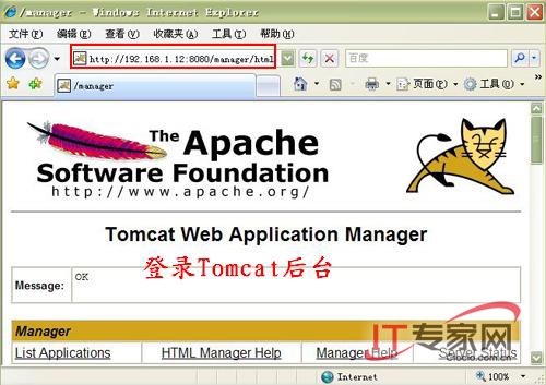 http://192.168.1.12:8080/manager/html。在瀏覽器中輸入該地址,回車后彈出登錄對話框,輸入默認的用戶名admin,默認的密碼為空,成功登錄后臺。(圖1)