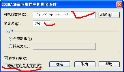 輸入phpisapi.dll文件的路徑,注意有些php網(wǎng)站需要把“確認文件是否存在”這個選項去掉的,擴展名寫.php: