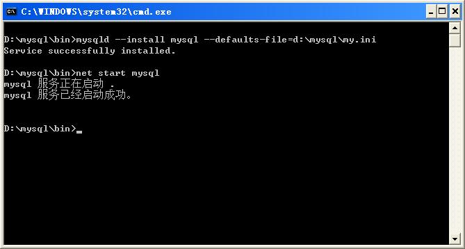 四、安裝mysql服務,切換到mysql\bin目錄,執(zhí)行如下命令,安裝并啟動mysql服務,注意my.ini配置文件的路徑要寫準確