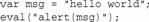 這里,變量msg是在eval()調(diào)用的環(huán)境外定義的,而警告仍然顯示的是文本"hello world",因?yàn)榈诙写a將被替換為一行真正的代碼。同樣,可以在eval()調(diào)用內(nèi)部定義函數(shù)或變量,然后在函數(shù)外的代碼中引用: