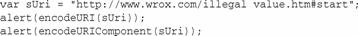 在這個(gè)例子中,變量uri存放的是用encodeURIComponent()編碼的字符串。生成的值說(shuō)明了應(yīng)用兩個(gè)解碼方法時(shí)會(huì)發(fā)生的事情。第一個(gè)值由decodeURI()輸出,把%20替換成空格。第二個(gè)值由decodeURIComponent()輸出,替換所有的特殊。