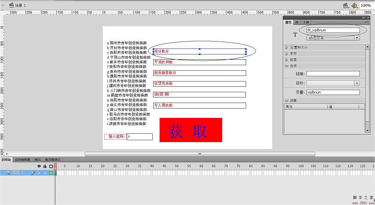 2、創(chuàng)建一個(gè)flash,我看網(wǎng)上的辦法是需要弄好幾個(gè)幀,一個(gè)用于發(fā)送,一個(gè)用于等待返回,一個(gè)用于顯示。由于我測(cè)試所有都顯示,那么不需要那么復(fù)雜,只需要使用動(dòng)態(tài)文本的變量監(jiān)測(cè)就可以實(shí)現(xiàn),所以我只有一幀,起名隨意,但是動(dòng)態(tài)文本的變量設(shè)置與返回的內(nèi)容一樣(這個(gè)非常重要)