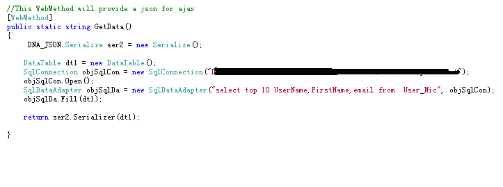 這里不僅能夠轉(zhuǎn)換Datatable還有DataSet,以后再擴(kuò)展JavascriptSerializer的轉(zhuǎn)換功能。需要注意的是轉(zhuǎn)化的最終結(jié)果需要是個(gè)[]包著的一段字符串.開(kāi)始我試著使用{}來(lái)最終返回json為對(duì)象,結(jié)果在客戶端真的是沒(méi)有頭緒根本就無(wú)法轉(zhuǎn)換。最后看到一篇文章介紹,在.net 3.5中你的web Services返回來(lái)的結(jié)果會(huì)自動(dòng)打包成一個(gè)json對(duì)象,且名字為d,如:{“d”:***}.所以我只有在服務(wù)器端的生成一個(gè)array形式的包。