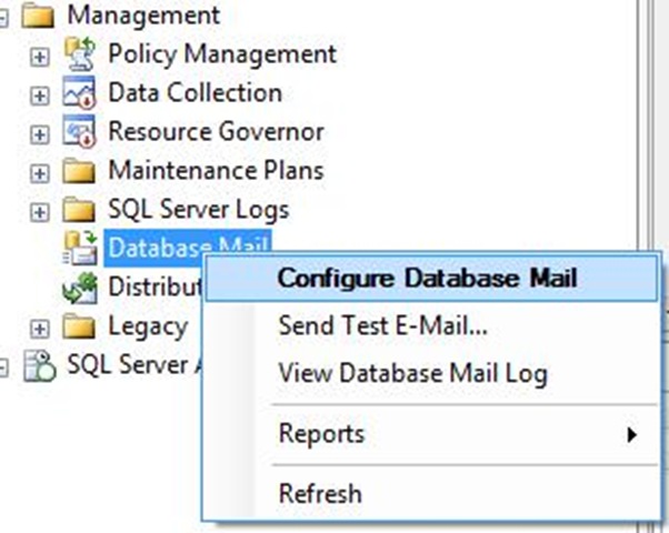 2.打開SQL Management Studio->Management->Database mail->Configure SMTP Settings.